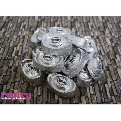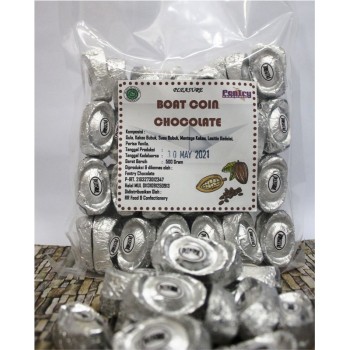 Coklat bentuk perahu/mata uang, rasa milk chocolate dibalut alufoil silver, melting rasa coklatnya, dibuat dari bahan berkualitas dan halal, dikemas dalam kemasan plastik 500g dan 1Kg.