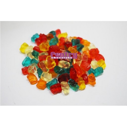 Jelly lunak berbentuk panda mini, warna warni dengan aneka rasa buah-buahan, dibuat dari bahan berkualitas dengan gelatin halal.